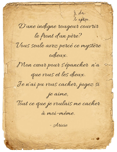 Pour le florilège, je trouvais intéressant de mettre en avant 5 vers du personnage d'Aricie pour montrer que malgré sa discrétion, elle était là, et qu'elle a fait ça, à ce moment-là dans cette pièce, qu'au final elle a existé à sa façon dans l’œuvre.